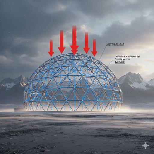 The dome’s skeleton is a mesh of interconnected triangles the strongest shape in engineering. - Stress Distribution: